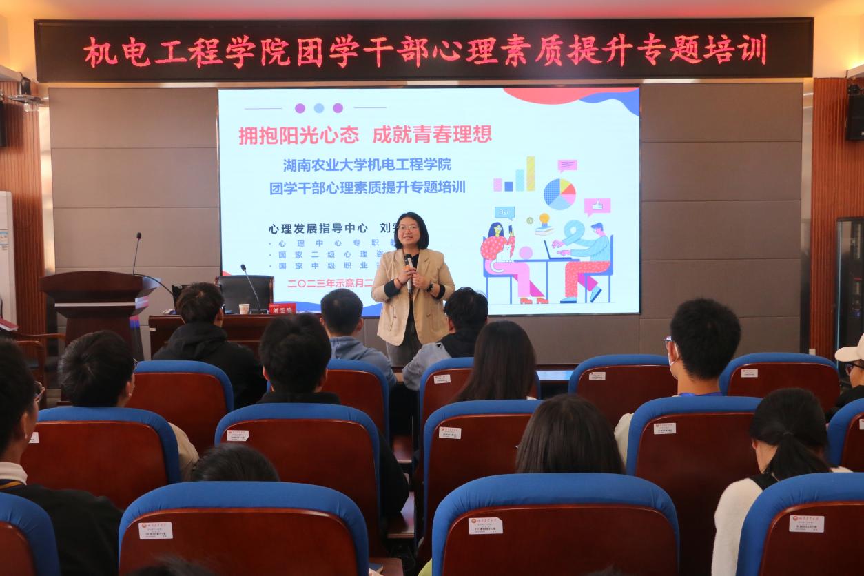 刘雯瑜老师首先以习近平总书记访问岳麓书院为背景,向团学干部说明作为新一代青年应不负时代、不负韶华。随后,她从“心理健康的基本定义、老员工团学干部积极心理的维度、多维提升心理素质、践行心理助人使命”4个方面向大家讲解怎样才能形成一个良好心态,让大家对心理健康有了更全面的了解。她指出,作为团学干部,单单满足自己的身心健康是不够的,更重要的是要有助人心理,要关注他人身心健康、助人阳光成长。